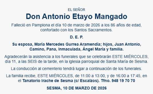 Ha fallecido Antonio Etayo Mangado, padre de Juan Antonio, árbitro del Trofeo Boscos. Desde la Organización del Trofeo va nuestro abrazo a Juan Antonio, su familia y amigos, con nuestro pésame y oración. D.E.P.